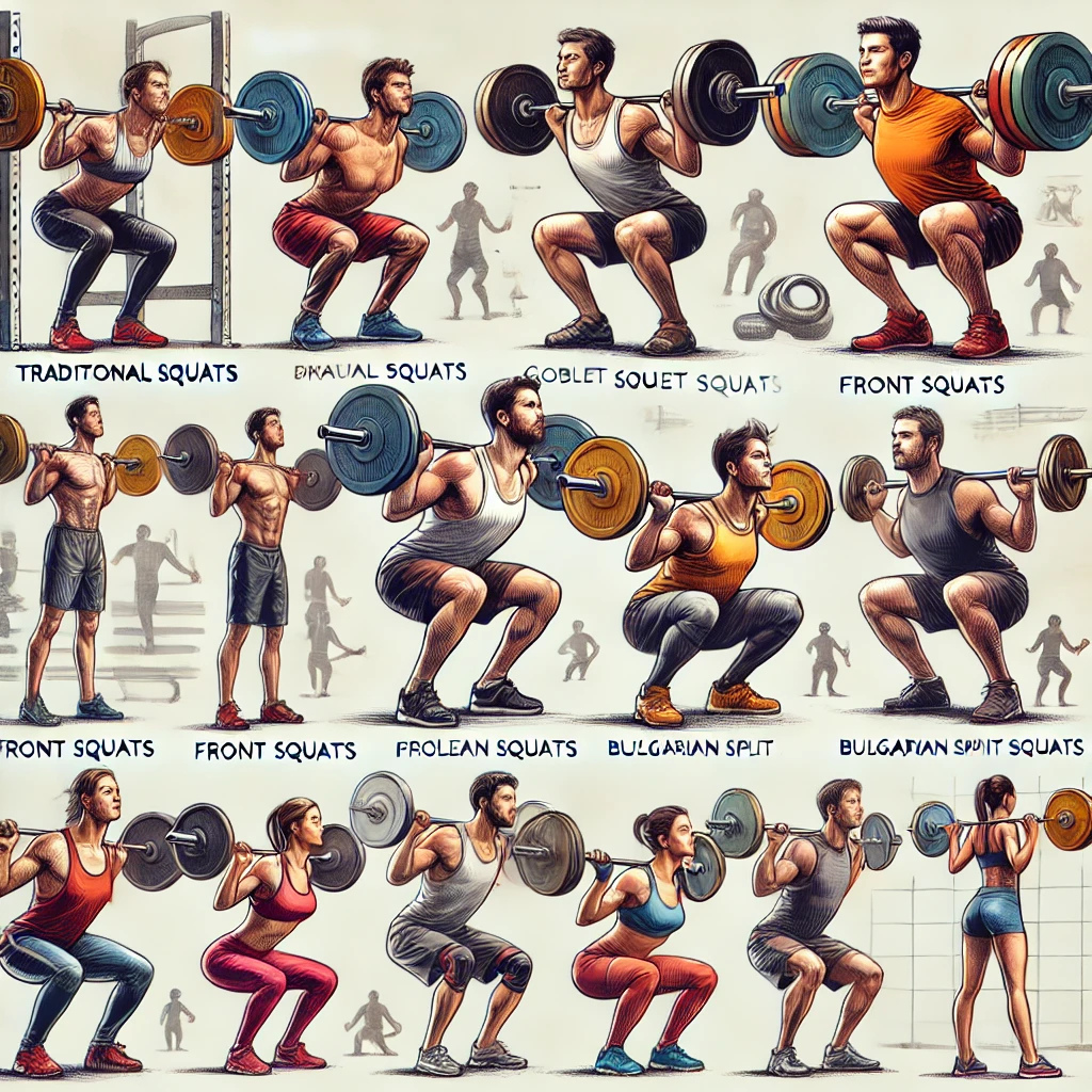 هناك العديد من الأنواع المختلفة لتمرين السكوات، وكل نوع يركز على مجموعة مختلفة من العضلات أو يحسن جانبًا معينًا من القوة أو اللياقة البدنية. فيما يلي أبرز أنواع السكوات: